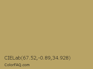 CIELab 67.52,-0.89,34.928 Color is a normal orange color and the nearest color is Husk #b7a458. Hex code #b8a365 and RGB value is rgb(184,163,101). In RGB color space, this color is composed of 72% red, 64% green, 40% blue, In CMYK color space, this color is composed of 0% cyan, 11% magenta, 45% yellow , 28% black , In HSL color space, this color has a hue angle of 45° , 37% saturation and 56% lightness.