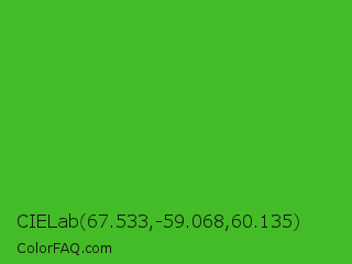 CIELab 67.533,-59.068,60.135 Color is a normal green color and the nearest color is Kelly Green #4cbb17. Hex code #44bc27 and RGB value is rgb(68,188,39). In RGB color space, this color is composed of 27% red, 74% green, 15% blue, In CMYK color space, this color is composed of 64% cyan, 0% magenta, 79% yellow , 26% black , In HSL color space, this color has a hue angle of 108° , 66% saturation and 45% lightness.