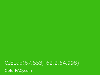 CIELab 67.553,-62.2,64.998 Color is a normal green color and the nearest color is Kelly Green #4cbb17. Hex code #3bbd12 and RGB value is rgb(59,189,18). In RGB color space, this color is composed of 23% red, 74% green, 7% blue, In CMYK color space, this color is composed of 69% cyan, 0% magenta, 90% yellow , 26% black , In HSL color space, this color has a hue angle of 106° , 83% saturation and 41% lightness.