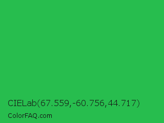 CIELab 67.559,-60.756,44.717 Color is a normal green color and the nearest color is Wageningen Green #34b233. Hex code #27bd4e and RGB value is rgb(39,189,78). In RGB color space, this color is composed of 15% red, 74% green, 31% blue, In CMYK color space, this color is composed of 79% cyan, 0% magenta, 59% yellow , 26% black , In HSL color space, this color has a hue angle of 136° , 66% saturation and 45% lightness.