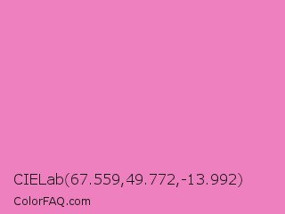 CIELab 67.559,49.772,-13.992 Color is a light magenta color and the nearest color is Persian Pink #f77fbe. Hex code #ee80bf and RGB value is rgb(238,128,191). In RGB color space, this color is composed of 93% red, 50% green, 75% blue, In CMYK color space, this color is composed of 0% cyan, 46% magenta, 20% yellow , 7% black , In HSL color space, this color has a hue angle of 326° , 76% saturation and 72% lightness.