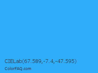 CIELab 67.589,-7.4,-47.595 Color is a normal blue color and the nearest color is Brilliant Azure #3399ff. Hex code #30adfa and RGB value is rgb(48,173,250). In RGB color space, this color is composed of 19% red, 68% green, 98% blue, In CMYK color space, this color is composed of 81% cyan, 31% magenta, 0% yellow , 2% black , In HSL color space, this color has a hue angle of 203° , 95% saturation and 58% lightness.