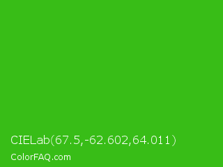 CIELab 67.5,-62.602,64.011 Color is a normal green color and the nearest color is Harlequin Green #46cb18. Hex code #38bd17 and RGB value is rgb(56,189,23). In RGB color space, this color is composed of 22% red, 74% green, 9% blue, In CMYK color space, this color is composed of 70% cyan, 0% magenta, 88% yellow , 26% black , In HSL color space, this color has a hue angle of 108° , 78% saturation and 42% lightness.
