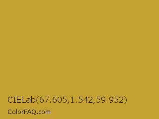 CIELab 67.605,1.542,59.952 Color is a normal yellow color and the nearest color is Satin Sheen Gold #cba135. Hex code #c4a130 and RGB value is rgb(196,161,48). In RGB color space, this color is composed of 77% red, 63% green, 19% blue, In CMYK color space, this color is composed of 0% cyan, 18% magenta, 76% yellow , 23% black , In HSL color space, this color has a hue angle of 46° , 61% saturation and 48% lightness.