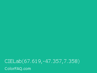 CIELab 67.619,-47.357,7.358 Color is a normal cyan color and the nearest color is Mountain Meadow Crayola #1ab385. Hex code #13ba96 and RGB value is rgb(19,186,150). In RGB color space, this color is composed of 7% red, 73% green, 59% blue, In CMYK color space, this color is composed of 90% cyan, 0% magenta, 19% yellow , 27% black , In HSL color space, this color has a hue angle of 167° , 81% saturation and 40% lightness.