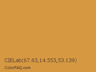 CIELab 67.63,14.553,53.139 Color is a normal orange color and the nearest color is Tigers Eye #e08d3c. Hex code #d69942 and RGB value is rgb(214,153,66). In RGB color space, this color is composed of 84% red, 60% green, 26% blue, In CMYK color space, this color is composed of 0% cyan, 29% magenta, 69% yellow , 16% black , In HSL color space, this color has a hue angle of 35° , 64% saturation and 55% lightness.