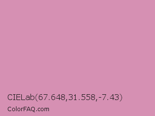 CIELab 67.648,31.558,-7.43 Color is a light rose color and the nearest color is Middle Purple #d982b5. Hex code #d690b3 and RGB value is rgb(214,144,179). In RGB color space, this color is composed of 84% red, 56% green, 70% blue, In CMYK color space, this color is composed of 0% cyan, 33% magenta, 16% yellow , 16% black , In HSL color space, this color has a hue angle of 330° , 46% saturation and 70% lightness.