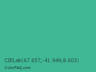 CIELab 67.657,-41.949,8.603 Color is a normal green color and the nearest color is Ocean Green #48bf91. Hex code #40b894 and RGB value is rgb(64,184,148). In RGB color space, this color is composed of 25% red, 72% green, 58% blue, In CMYK color space, this color is composed of 65% cyan, 0% magenta, 20% yellow , 28% black , In HSL color space, this color has a hue angle of 162° , 48% saturation and 49% lightness.