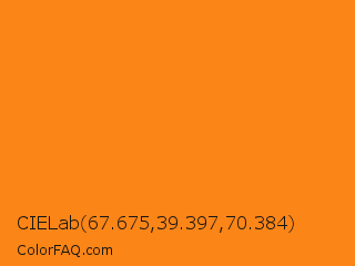 CIELab 67.675,39.397,70.384 Color is a normal orange color and the nearest color is Ecstasy #fa7814. Hex code #fc8517 and RGB value is rgb(252,133,23). In RGB color space, this color is composed of 99% red, 52% green, 9% blue, In CMYK color space, this color is composed of 0% cyan, 47% magenta, 91% yellow , 1% black , In HSL color space, this color has a hue angle of 29° , 97% saturation and 54% lightness.