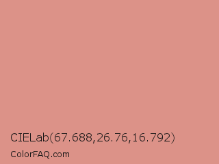 CIELab 67.688,26.76,16.792 Color is a light red color and the nearest color is My Pink #d69188. Hex code #dc9288 and RGB value is rgb(220,146,136). In RGB color space, this color is composed of 86% red, 57% green, 53% blue, In CMYK color space, this color is composed of 0% cyan, 34% magenta, 38% yellow , 14% black , In HSL color space, this color has a hue angle of 7° , 55% saturation and 70% lightness.