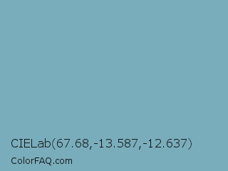 CIELab 67.68,-13.587,-12.637 Color is a normal cyan color and the nearest color is Moonstone Blue #73a9c2. Hex code #79adbb and RGB value is rgb(121,173,187). In RGB color space, this color is composed of 47% red, 68% green, 73% blue, In CMYK color space, this color is composed of 35% cyan, 7% magenta, 0% yellow , 27% black , In HSL color space, this color has a hue angle of 193° , 33% saturation and 60% lightness.