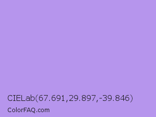 CIELab 67.691,29.897,-39.846 Color is a light violet color and the nearest color is Bright Lavender #bf94e4. Hex code #b695ed and RGB value is rgb(182,149,237). In RGB color space, this color is composed of 71% red, 58% green, 93% blue, In CMYK color space, this color is composed of 23% cyan, 37% magenta, 0% yellow , 7% black , In HSL color space, this color has a hue angle of 263° , 71% saturation and 76% lightness.