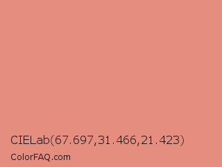 CIELab 67.697,31.466,21.423 Color is a light red color and the nearest color is Dark Salmon #e9967a. Hex code #e58e80 and RGB value is rgb(229,142,128). In RGB color space, this color is composed of 90% red, 56% green, 50% blue, In CMYK color space, this color is composed of 0% cyan, 38% magenta, 44% yellow , 10% black , In HSL color space, this color has a hue angle of 8° , 66% saturation and 70% lightness.