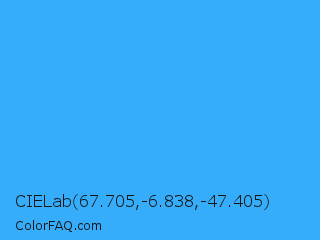 CIELab 67.705,-6.838,-47.405 Color is a normal blue color and the nearest color is Brilliant Azure #3399ff. Hex code #36adfa and RGB value is rgb(54,173,250). In RGB color space, this color is composed of 21% red, 68% green, 98% blue, In CMYK color space, this color is composed of 78% cyan, 31% magenta, 0% yellow , 2% black , In HSL color space, this color has a hue angle of 204° , 95% saturation and 60% lightness.