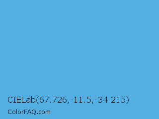 CIELab 67.726,-11.5,-34.215 Color is a light blue color and the nearest color is Blue Jeans #5dadec. Hex code #53aee2 and RGB value is rgb(83,174,226). In RGB color space, this color is composed of 33% red, 68% green, 89% blue, In CMYK color space, this color is composed of 63% cyan, 23% magenta, 0% yellow , 11% black , In HSL color space, this color has a hue angle of 202° , 71% saturation and 61% lightness.