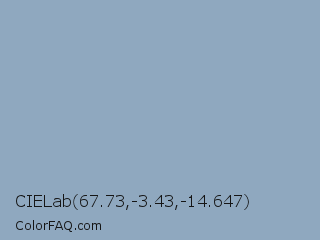 CIELab 67.73,-3.43,-14.647 Color is a light blue color and the nearest color is Nepal #8eabc1. Hex code #8fa8bf and RGB value is rgb(143,168,191). In RGB color space, this color is composed of 56% red, 66% green, 75% blue, In CMYK color space, this color is composed of 25% cyan, 12% magenta, 0% yellow , 25% black , In HSL color space, this color has a hue angle of 209° , 27% saturation and 65% lightness.