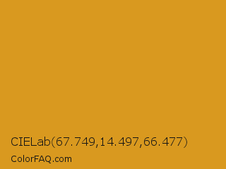 CIELab 67.749,14.497,66.477 Color is a normal orange color and the nearest color is Golden Grass #daa520. Hex code #d9991f and RGB value is rgb(217,153,31). In RGB color space, this color is composed of 85% red, 60% green, 12% blue, In CMYK color space, this color is composed of 0% cyan, 29% magenta, 86% yellow , 15% black , In HSL color space, this color has a hue angle of 39° , 75% saturation and 49% lightness.