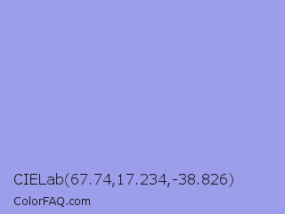 CIELab 67.74,17.234,-38.826 Color is a light blue color and the nearest color is Dull Lavender #a899e6. Hex code #9d9eeb and RGB value is rgb(157,158,235). In RGB color space, this color is composed of 62% red, 62% green, 92% blue, In CMYK color space, this color is composed of 33% cyan, 33% magenta, 0% yellow , 8% black , In HSL color space, this color has a hue angle of 239° , 66% saturation and 77% lightness.