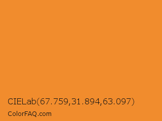 CIELab 67.759,31.894,63.097 Color is a normal orange color and the nearest color is Cadmium Orange #ed872d. Hex code #f18c2d and RGB value is rgb(241,140,45). In RGB color space, this color is composed of 95% red, 55% green, 18% blue, In CMYK color space, this color is composed of 0% cyan, 42% magenta, 81% yellow , 5% black , In HSL color space, this color has a hue angle of 29° , 88% saturation and 56% lightness.