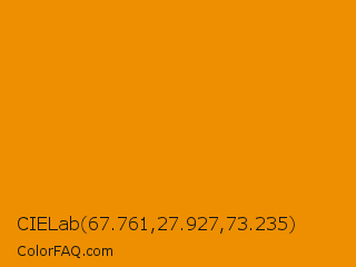 CIELab 67.761,27.927,73.235 Color is a normal orange color and the nearest color is Tangerine #f28500. Hex code #ed8f00 and RGB value is rgb(237,143,0). In RGB color space, this color is composed of 93% red, 56% green, 0% blue, In CMYK color space, this color is composed of 0% cyan, 40% magenta, 100% yellow , 7% black , In HSL color space, this color has a hue angle of 36° , 100% saturation and 46% lightness.