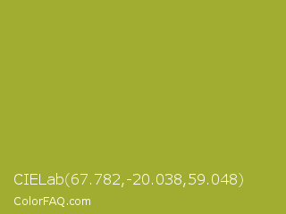 CIELab 67.782,-20.038,59.048 Color is a normal yellow color and the nearest color is Citron #9fa91f. Hex code #a1ad30 and RGB value is rgb(161,173,48). In RGB color space, this color is composed of 63% red, 68% green, 19% blue, In CMYK color space, this color is composed of 7% cyan, 0% magenta, 72% yellow , 32% black , In HSL color space, this color has a hue angle of 66° , 57% saturation and 43% lightness.