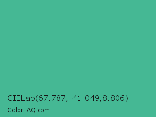 CIELab 67.787,-41.049,8.806 Color is a normal green color and the nearest color is Ocean Green #48bf91. Hex code #45b894 and RGB value is rgb(69,184,148). In RGB color space, this color is composed of 27% red, 72% green, 58% blue, In CMYK color space, this color is composed of 63% cyan, 0% magenta, 20% yellow , 28% black , In HSL color space, this color has a hue angle of 161° , 45% saturation and 50% lightness.