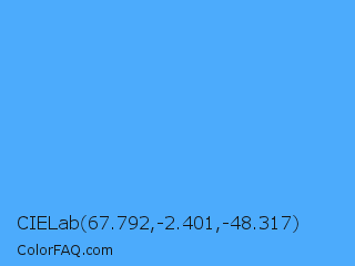 CIELab 67.792,-2.401,-48.317 Color is a light blue color and the nearest color is Picton Blue #45b1e8. Hex code #4cabfc and RGB value is rgb(76,171,252). In RGB color space, this color is composed of 30% red, 67% green, 99% blue, In CMYK color space, this color is composed of 70% cyan, 32% magenta, 0% yellow , 1% black , In HSL color space, this color has a hue angle of 208° , 97% saturation and 64% lightness.
