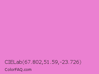 CIELab 67.802,51.59,-23.726 Color is a light magenta color and the nearest color is Princess Perfume #ff85cf. Hex code #eb80d1 and RGB value is rgb(235,128,209). In RGB color space, this color is composed of 92% red, 50% green, 82% blue, In CMYK color space, this color is composed of 0% cyan, 46% magenta, 11% yellow , 8% black , In HSL color space, this color has a hue angle of 315° , 73% saturation and 71% lightness.