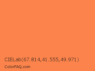 CIELab 67.814,41.555,49.971 Color is a light orange color and the nearest color is Coral #ff7f50. Hex code #fc844c and RGB value is rgb(252,132,76). In RGB color space, this color is composed of 99% red, 52% green, 30% blue, In CMYK color space, this color is composed of 0% cyan, 48% magenta, 70% yellow , 1% black , In HSL color space, this color has a hue angle of 19° , 97% saturation and 64% lightness.