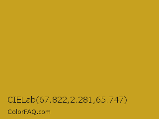 CIELab 67.822,2.281,65.747 Color is a normal yellow color and the nearest color is Lemon Curry #cca01d. Hex code #c7a11f and RGB value is rgb(199,161,31). In RGB color space, this color is composed of 78% red, 63% green, 12% blue, In CMYK color space, this color is composed of 0% cyan, 19% magenta, 84% yellow , 22% black , In HSL color space, this color has a hue angle of 46° , 73% saturation and 45% lightness.