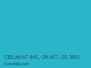 CIELab 67.841,-28.607,-20.383 Color is a normal cyan color and the nearest color is Ball Blue #21abcd. Hex code #2ab5c9 and RGB value is rgb(42,181,201). In RGB color space, this color is composed of 16% red, 71% green, 79% blue, In CMYK color space, this color is composed of 79% cyan, 10% magenta, 0% yellow , 21% black , In HSL color space, this color has a hue angle of 188° , 65% saturation and 48% lightness.