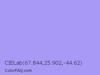 CIELab 67.844,25.902,-44.62 Color is a light indigo color and the nearest color is Dull Lavender #a899e6. Hex code #a899f6 and RGB value is rgb(168,153,246). In RGB color space, this color is composed of 66% red, 60% green, 96% blue, In CMYK color space, this color is composed of 32% cyan, 38% magenta, 0% yellow , 4% black , In HSL color space, this color has a hue angle of 250° , 84% saturation and 78% lightness.