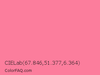 CIELab 67.846,51.377,6.364 Color is a light red color and the nearest color is Tickle Me Pink Crayola #fc80a5. Hex code #fc7d9c and RGB value is rgb(252,125,156). In RGB color space, this color is composed of 99% red, 49% green, 61% blue, In CMYK color space, this color is composed of 0% cyan, 50% magenta, 38% yellow , 1% black , In HSL color space, this color has a hue angle of 345° , 95% saturation and 74% lightness.