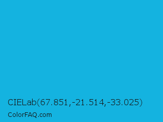 CIELab 67.851,-21.514,-33.025 Color is a normal cyan color and the nearest color is Battery Charged Blue #1dacd6. Hex code #14b3e0 and RGB value is rgb(20,179,224). In RGB color space, this color is composed of 8% red, 70% green, 88% blue, In CMYK color space, this color is composed of 91% cyan, 20% magenta, 0% yellow , 12% black , In HSL color space, this color has a hue angle of 193° , 84% saturation and 48% lightness.