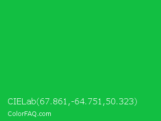 CIELab 67.861,-64.751,50.323 Color is a normal green color and the nearest color is Dark Pastel Green #03c03c. Hex code #12bf42 and RGB value is rgb(18,191,66). In RGB color space, this color is composed of 7% red, 75% green, 26% blue, In CMYK color space, this color is composed of 91% cyan, 0% magenta, 65% yellow , 25% black , In HSL color space, this color has a hue angle of 137° , 83% saturation and 41% lightness.