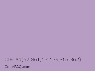 CIELab 67.861,17.139,-16.362 Color is a light purple color and the nearest color is London Hue #bea6c3. Hex code #b79cc3 and RGB value is rgb(183,156,195). In RGB color space, this color is composed of 72% red, 61% green, 76% blue, In CMYK color space, this color is composed of 6% cyan, 20% magenta, 0% yellow , 24% black , In HSL color space, this color has a hue angle of 282° , 25% saturation and 69% lightness.