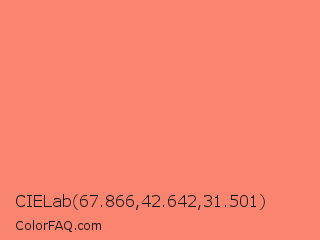 CIELab 67.866,42.642,31.501 Color is a light red color and the nearest color is Salmon #fa8072. Hex code #f9846f and RGB value is rgb(249,132,111). In RGB color space, this color is composed of 98% red, 52% green, 44% blue, In CMYK color space, this color is composed of 0% cyan, 47% magenta, 55% yellow , 2% black , In HSL color space, this color has a hue angle of 9° , 92% saturation and 71% lightness.