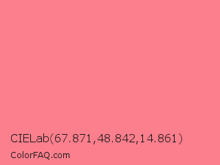 CIELab 67.871,48.842,14.861 Color is a light red color and the nearest color is Tulip #ff878d. Hex code #fc7f8d and RGB value is rgb(252,127,141). In RGB color space, this color is composed of 99% red, 50% green, 55% blue, In CMYK color space, this color is composed of 0% cyan, 50% magenta, 44% yellow , 1% black , In HSL color space, this color has a hue angle of 353° , 95% saturation and 74% lightness.