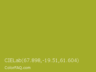 CIELab 67.898,-19.51,61.604 Color is a normal yellow color and the nearest color is Citron #9fa91f. Hex code #a3ad29 and RGB value is rgb(163,173,41). In RGB color space, this color is composed of 64% red, 68% green, 16% blue, In CMYK color space, this color is composed of 6% cyan, 0% magenta, 76% yellow , 32% black , In HSL color space, this color has a hue angle of 65° , 62% saturation and 42% lightness.