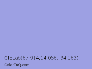 CIELab 67.914,14.056,-34.163 Color is a light blue color and the nearest color is Dull Lavender #a899e6. Hex code #9da0e3 and RGB value is rgb(157,160,227). In RGB color space, this color is composed of 62% red, 63% green, 89% blue, In CMYK color space, this color is composed of 31% cyan, 30% magenta, 0% yellow , 11% black , In HSL color space, this color has a hue angle of 237° , 56% saturation and 75% lightness.