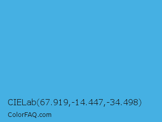 CIELab 67.919,-14.447,-34.498 Color is a normal blue color and the nearest color is Picton Blue #45b1e8. Hex code #45b0e3 and RGB value is rgb(69,176,227). In RGB color space, this color is composed of 27% red, 69% green, 89% blue, In CMYK color space, this color is composed of 70% cyan, 22% magenta, 0% yellow , 11% black , In HSL color space, this color has a hue angle of 199° , 74% saturation and 58% lightness.