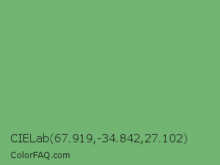 CIELab 67.919,-34.842,27.102 Color is a normal green color and the nearest color is Iguana Green #71bc78. Hex code #72b573 and RGB value is rgb(114,181,115). In RGB color space, this color is composed of 45% red, 71% green, 45% blue, In CMYK color space, this color is composed of 37% cyan, 0% magenta, 36% yellow , 29% black , In HSL color space, this color has a hue angle of 121° , 31% saturation and 58% lightness.