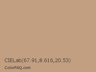CIELab 67.91,8.616,20.53 Color is a light orange color and the nearest color is Pale Taupe #bc987e. Hex code #c29f81 and RGB value is rgb(194,159,129). In RGB color space, this color is composed of 76% red, 62% green, 51% blue, In CMYK color space, this color is composed of 0% cyan, 18% magenta, 34% yellow , 24% black , In HSL color space, this color has a hue angle of 28° , 35% saturation and 63% lightness.
