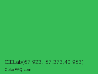 CIELab 67.923,-57.373,40.953 Color is a normal green color and the nearest color is Chateau Green #40a860. Hex code #36bd57 and RGB value is rgb(54,189,87). In RGB color space, this color is composed of 21% red, 74% green, 34% blue, In CMYK color space, this color is composed of 71% cyan, 0% magenta, 54% yellow , 26% black , In HSL color space, this color has a hue angle of 135° , 56% saturation and 48% lightness.
