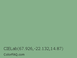 CIELab 67.926,-22.132,14.87 Color is a light green color and the nearest color is Bay Leaf #7da98d. Hex code #85b08a and RGB value is rgb(133,176,138). In RGB color space, this color is composed of 52% red, 69% green, 54% blue, In CMYK color space, this color is composed of 24% cyan, 0% magenta, 22% yellow , 31% black , In HSL color space, this color has a hue angle of 127° , 21% saturation and 61% lightness.