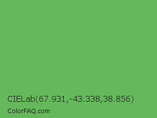 CIELab 67.931,-43.338,38.856 Color is a normal green color and the nearest color is Fern #63b76c. Hex code #66b85c and RGB value is rgb(102,184,92). In RGB color space, this color is composed of 40% red, 72% green, 36% blue, In CMYK color space, this color is composed of 45% cyan, 0% magenta, 50% yellow , 28% black , In HSL color space, this color has a hue angle of 113° , 39% saturation and 54% lightness.