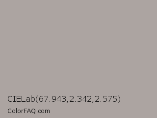 CIELab 67.943,2.342,2.575 Color is a light orange color and the nearest color is Cloudy #aca59f. Hex code #aca4a1 and RGB value is rgb(172,164,161). In RGB color space, this color is composed of 67% red, 64% green, 63% blue, In CMYK color space, this color is composed of 0% cyan, 5% magenta, 6% yellow , 33% black , In HSL color space, this color has a hue angle of 16° , 6% saturation and 65% lightness.