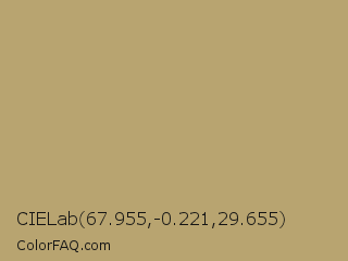 CIELab 67.955,-0.221,29.655 Color is a normal orange color and the nearest color is Desert Camel #c19a6b. Hex code #b8a470 and RGB value is rgb(184,164,112). In RGB color space, this color is composed of 72% red, 64% green, 44% blue, In CMYK color space, this color is composed of 0% cyan, 11% magenta, 39% yellow , 28% black , In HSL color space, this color has a hue angle of 43° , 34% saturation and 58% lightness.