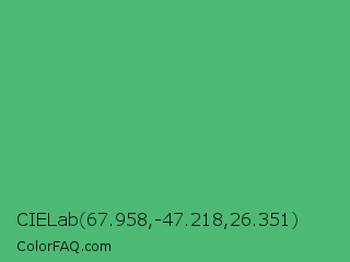 CIELab 67.958,-47.218,26.351 Color is a normal green color and the nearest color is Emerald #50c878. Hex code #4cba74 and RGB value is rgb(76,186,116). In RGB color space, this color is composed of 30% red, 73% green, 45% blue, In CMYK color space, this color is composed of 59% cyan, 0% magenta, 38% yellow , 27% black , In HSL color space, this color has a hue angle of 142° , 44% saturation and 51% lightness.