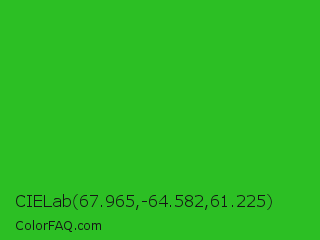 CIELab 67.965,-64.582,61.225 Color is a normal green color and the nearest color is Lime Green #32cd32. Hex code #2cbf24 and RGB value is rgb(44,191,36). In RGB color space, this color is composed of 17% red, 75% green, 14% blue, In CMYK color space, this color is composed of 77% cyan, 0% magenta, 81% yellow , 25% black , In HSL color space, this color has a hue angle of 117° , 68% saturation and 45% lightness.
